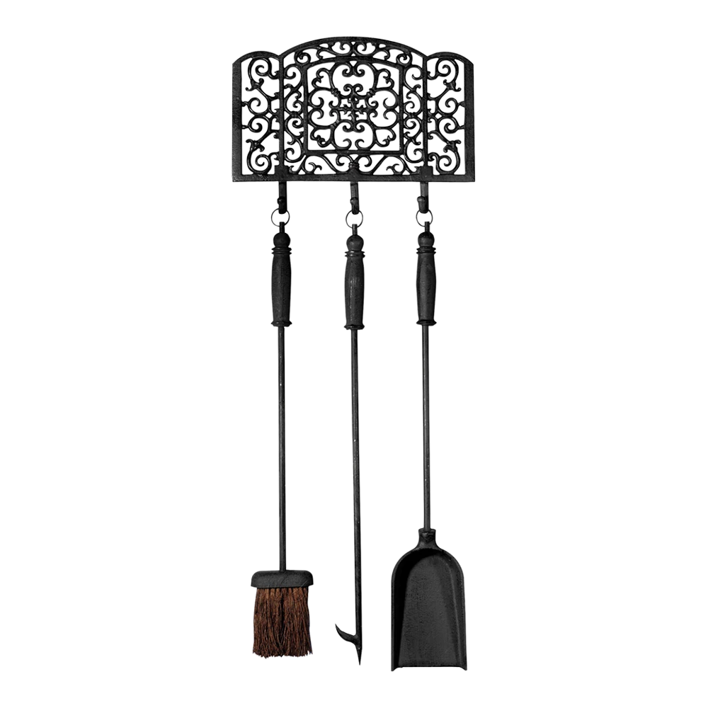 Wat is er gezelliger dan tijdens koude avonden het geluid te horen van een knisperend haardblok. Deze klassieke haardgereedschapset bestaat uit drie stuks gereedschap en een muurhouder met sierlijke krullen. Bij deze set worden een schep, een pook en een bezem geleverd, dit om de haard optimaal te kunnen onderhouden. Het gereedschap is ideaal voor het opruimen en schoonmaken van de haard. De gietijzeren onderdelen zijn met de hand gegoten volgens eeuwenoud vakmanschap en traditie.