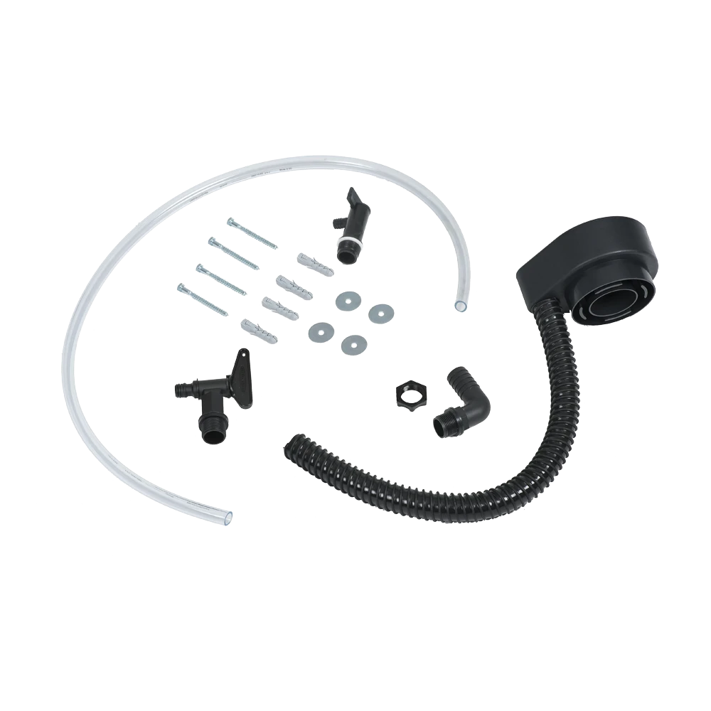 Met de kraan aan de voorkant van de regentank kun je een gieter of emmer vullen door deze gewoon op de grond te zetten. Op de snelloopkraan onderin kan een leiding worden aangesloten, als extra gebruiksoptie.