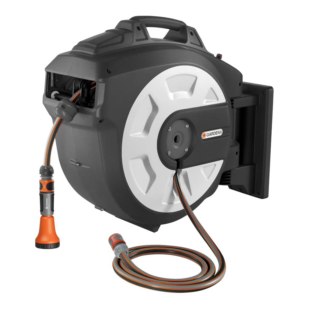 De GARDENA Comfort wandslangenbox 35 roll-up automatic maakt besproeien bijzonder eenvoudig en comfortabel. De slang wordt automatisch opgerold. De praktische slangenbox wordt aan de muur bevestigd en is 180 ° zwenkbaar. De slang kan met weinig inspanning worden uitgetrokken en gestopt met korte tussenpozen van maximaal 50 cm. De kwaliteitsslang van 13 mm (½”) levert een hoge waterdoorstroom en optimale werking van de sproeier. Met een korte ruk aan de slang, wordt de vergrendeling opgeheven en wordt de slang door de roll-up automatisch de box ingetrokken zonder dat u hier verder iets voor hoeft te doen. Uw handen blijven schoon. Een geïntegreerde stalen veer perfect op de slanglengte afgestemd, zorgt voor een krachtige, gelijkmatige slangretractie. De geïntegreerde slanggeleider voorkomt verdraaien en verstrengeling van de slang. Na gebruik kan de aansluitslang eenvoudig op de druppelstop bevestigd worden om weglopen van water te voorkomen. Broezen, sproeiers en wasborstels kunnen worden opgehangen aan de wandhouder zodat ze altijd onder handbereik zijn. Voor de winter kan de slangenbox eenvoudig met de ergonomisch gevormde handgreep van de houder afgehaald worden voor opslag in een vorstvrije ruimte. De wandslangenbox is compleet uitgerust met een 35-meter lange kwaliteitsslang, een 1,5 meter lange aansluitslang, een traploos verstelbare tuinspuit (art. nr. 8114) en de benodigde Original GARDENA System onderdelen: drie slangstukken (art.nr. 900, 901, 902), een standaard slangkoppeling (art. nr. 915) en een waterstop (art.nr. 913). Dankzij de meegeleverde wandhouder, samen met schroeven en pluggen, is de montage een fluitje van een cent. Besproeien is heel eenvoudig – met de Comfort wandslangenbox 35 roll-up automatisch.
