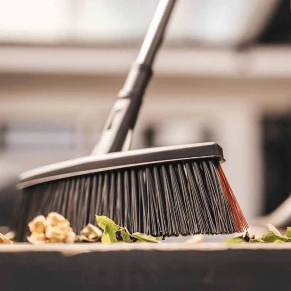 Blad en ander tuinafval worden in één beweging weggeveegd. De uiteinden van de bezem zijn naar binnen gebogen: ideaal om al het vuil bij elkaar te vegen.